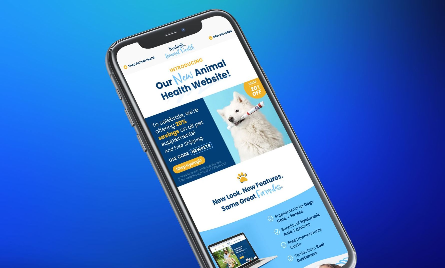 Hyalogic and Hyalogic Animal Health provide hyaluronic acid supplements to people and pets alike. They need ongoing creative work for emails, social media, and updates to their printed materials. The Animal Health side has received a website branding update to visually separate it into the pet space.